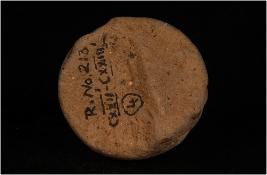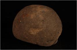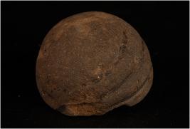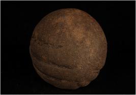 | Description / विवरण | A terracotta sling ball decorated with incised lines. |