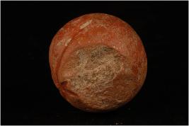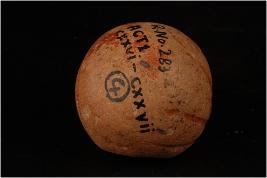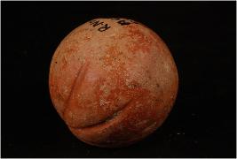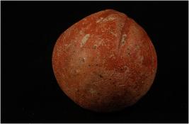 | Description / विवरण | A terracotta sling ball decorated with incised lines. |