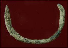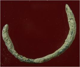 | Description / विवरण | Trench A-9, LxB-D 4.10 mtrs x 4.30 mtrs - 3.25 mtrs B peg ZA9, Stratum Layer 11 It s a rod made of copper of green colour and rough surface. It s in the shape of semicircle. It was used as a tool. |