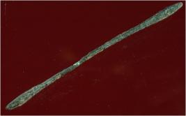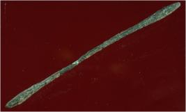 | Description / विवरण | Trench ZA9, LxB-D 5 mtrs x 1.30 mtrs - 2.10 mtrs, Stratum Layer 12 It s a copper rod made of copper of green colour and rough surface. It s a thin rod with some thickness on two ends. Hard patina is present on it. It was used as a tool. |
