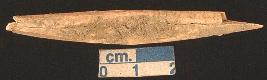 | Description / विवरण | A bone arrowhead , one end is pointed end other it damaged, light yellowish. |
