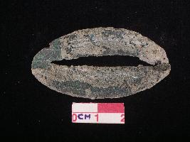 | Description / विवरण | A copper blade look like lips object with heavy patina all over it . |