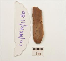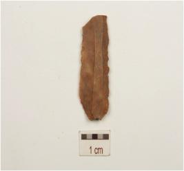 | Description / विवरण | Fragment of parallel sided blade made on chert, two ridges on dorsal, prominent bulb on ventral, wear marks along cutting edges. |