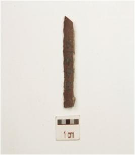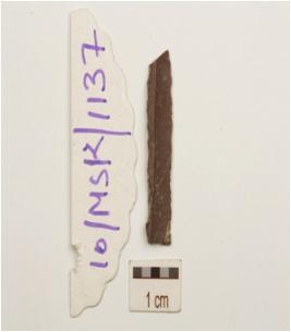 | Description / विवरण | Fragment of parallel sided blade made on chert, wear marks along cutting edges. |