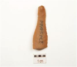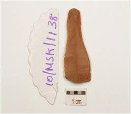 | Description / विवरण | Fragment of a chert blade, one ridge on dorsal, bulb on ventral, wear marks along cutting edges. |