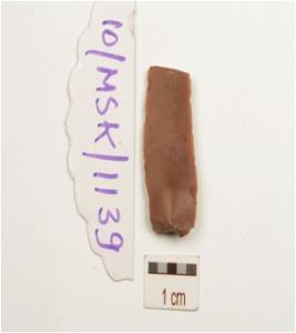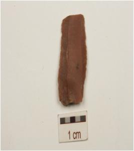 | Description / विवरण | Fragment of parallel sided blade made on chert, two ridges on dorsal, bulb on ventral, wear marks along cutting edges. |