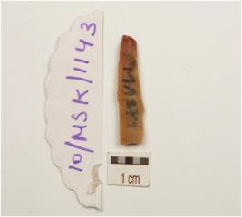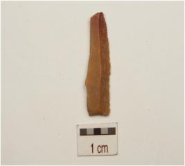 | Description / विवरण | Fragment of parallel sided blade made on chert ,one ridge on dorsal, bulb on ventral, wear marks along cutting edges. |