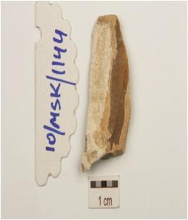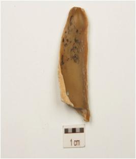 | Description / विवरण | Fragment of a blade made on chert, wear marks along cutting edges, cortex with scars on dorsal and bulb on ventral. |