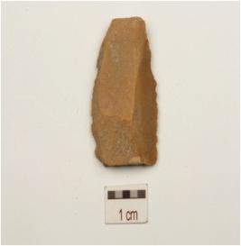 | Description / विवरण | Fragment of a chert blade, ridge on dorsal, prominent bulb on ventral, wear marks along cutting edges. |