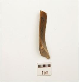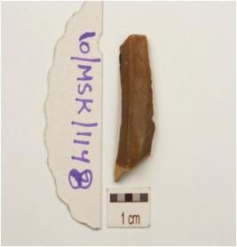 | Description / विवरण | Fragment of parallel sided blade made on chert, two ridges on dorsal, prominent bulb on ventral surface in wear marks along cutting edges. |