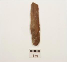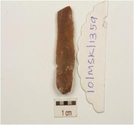 | Description / विवरण | A blade made on chert, two ridges on the dorsal surface, trapezoidal cross section, prepared platform and wear marks along cutting edges. |