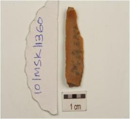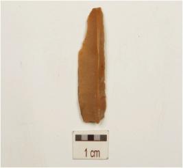 | Description / विवरण | A blade made on chert , a ridge on the dorsal, triangular cross section, prepared platform and wear marks along cutting edges. |