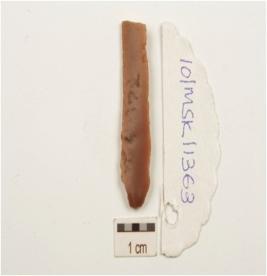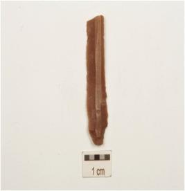 | Description / विवरण | A blade made on chert, two ridges on the dorsal, trapezoidal cross section,prominent bulb on the ventral, wear marks along cutting marks and prepared platform. |