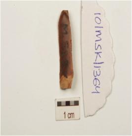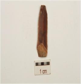 | Description / विवरण | A blade made on chert , a ridge on the dorsal, prominent bulb on the ventral, triangular cross section distal end struck, wear marks along cutting marks and prepared platform. |