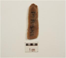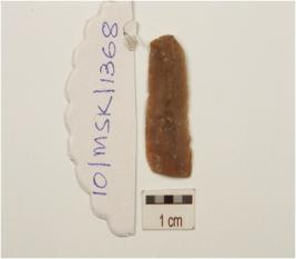 | Description / विवरण | A blade made on chert , two ridges on the dorsal, prominent bulb on the ventral, trapezoidal cross section, wear marks along cutting edges and prepared platform. |