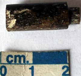 | Description / विवरण | Fragment of a tanged bone arrowhead, blackish, polished surface, circular section. |