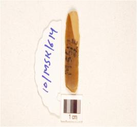 | Description / विवरण | A parallel sided blade made on chert ridge on dorsal, diffused bulb on ventral, and use marks on along working edges. |