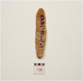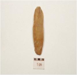 | Description / विवरण | Fragment of a chert blade , single ridge on dorsal, prominent bulb on ventral, use-wear marks along the working edges and triangular cross-section. |