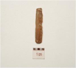 | Description / विवरण | Fragment of a chert blade with double ridge on dorsal, use wear marks along the working edges and trapezoidal cross section. |