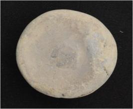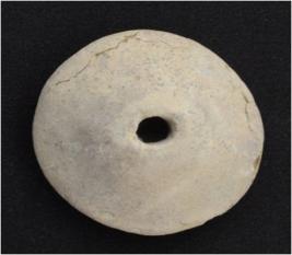 | Description / विवरण | Trench D, Stratum layer 36. It is a wheel made of sun baked clay. Shape is almost circular. It has a blocked hole. Cracked near the margin Appearance is muddy. |