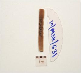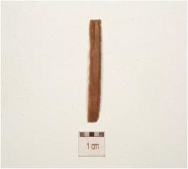 | Description / विवरण | Fragment of a chert blade with double ridge on dorsal, use-wear marks on working edges, prominent bulb on ventral and trapezoidal cross section. |