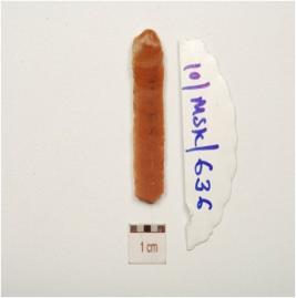 | Description / विवरण | Fragment of a chert blade with double ridge on dorsal, use-wear marks on working edges, prominent bulb on ventral and trapezoidal cross-section. |