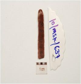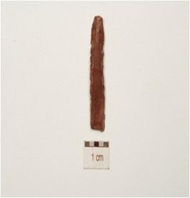 | Description / विवरण | Fragment of a chert blade with double ridge on dorsal, use-wear marks on working edges, prominent bulb on ventral and trapezoidal cross-section. |