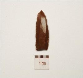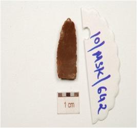 | Description / विवरण | Fragment of a chert blade with double ridge on dorsal, prominent bulb on ventral side and trapezoidal cross-section. |