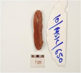 | Description / विवरण | An utilized flake made on chert diffused bulb on ventral, prepared platform use-wear marks on working edges, single ridge on dorsal and triangular cross- section. |