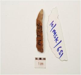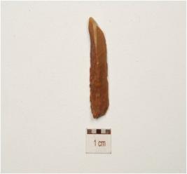 | Description / विवरण | Fragment of a chert blade with single ridge on dorsal, use-wear marks on working edges, prominent bulb on ventral and triangular cross-section. |