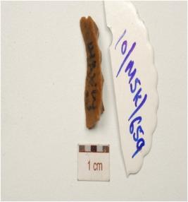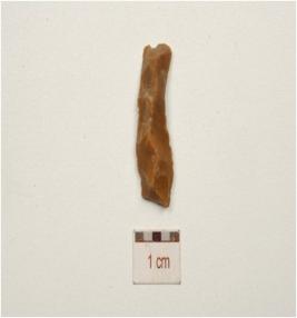 | Description / विवरण | Fragment of a chert blade with single ridge on dorsal, use - wear marks on working edges, diffused bulb on ventral and triangular cross, section. |