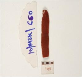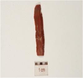 | Description / विवरण | Fragment of a chert blade with single ridge on dorsal, use-wear marks on working edges, prominent bulb on ventral, triangular cross-section. |