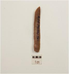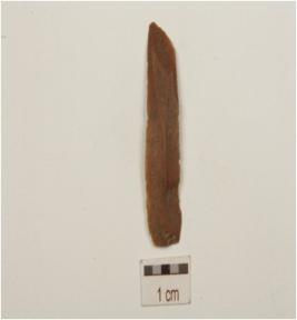 | Description / विवरण | A chert blade with mid-ridge on dorsal, triangular cross section, striking platform and use-wear Maski, Karnataka on cutting edges. |