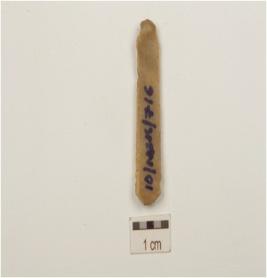 | Description / विवरण | A parallel sided chert blade with double ridge on dorsal, bulb on ventral prepared paltform, trapezoidal cross section and use wear marks on cutting edge. |