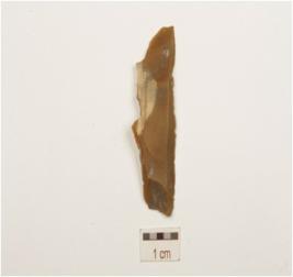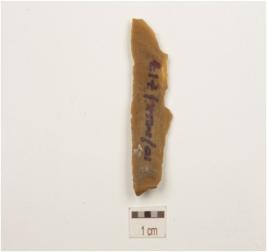 | Description / विवरण | A Chert blade with single ridge on dorsal, triangular cross-section, use wear marks on cutting edge and broken along distal end. |