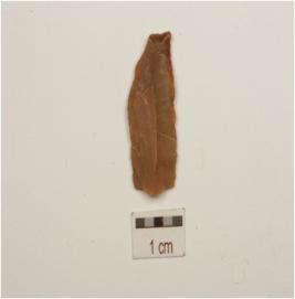| Description / विवरण | A Chert blade with mid ridge on dorsal, triangular cross-section, use wear marks on cutting, edge and broken along proximal end. |