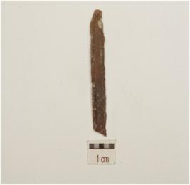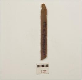 | Description / विवरण | A parallel sided chert blade with double ridge on dorsal, trapezoidal cross-section, use wear marks on cutting edge and broken along proximal end. |