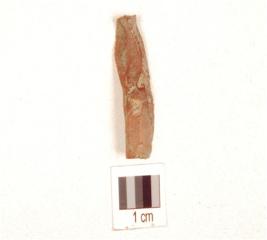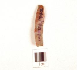 | Description / विवरण | A chert blade with double ridge on dorsal, trapezoidal cross-section, partly chipped bulb prepered platform and use wear marks on cutting edge. |