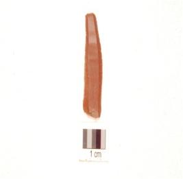 | Description / विवरण | A chert blade with double ridge on dorsal trapezoidal cross-section, use wear marks on cutting edges. |