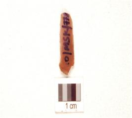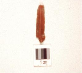 | Description / विवरण | A chert blade with prominent mid-ridge on dorsal, bulb on ventral, prepared platform, triangular cross-section and use-wear marks on cutting edge. |