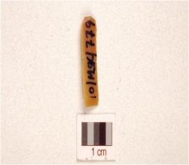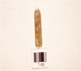 | Description / विवरण | A chert blade with prominent mid-ridge on dorsal, triangular cross-section, prepared platform, bulb on ventral and use wear marks on cutting edge. |