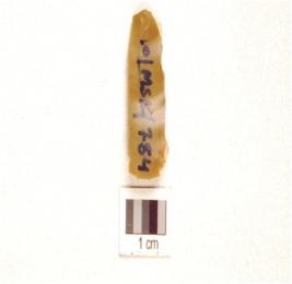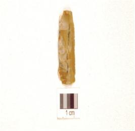 | Description / विवरण | A chert blade in prominent single ridge on dorsal, prepared platform, bulb on ventral and use-wear marks on cutting edge. |