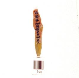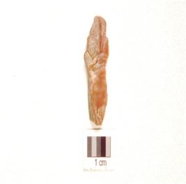 | Description / विवरण | A chert blade prominent mid-ridge on dorsal, triangular cross-section, prepared platform, bulb on ventral, and use-wear marks on cutting edge. |
