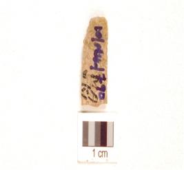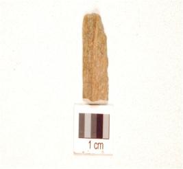 | Description / विवरण | A chert blade prominent mid-ridge on dorsal, triangular cross-section, use wear marks on cutting edge, and broken proximal end. |