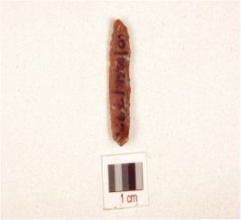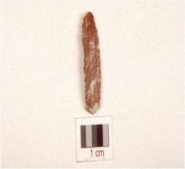 | Description / विवरण | A chert blade double ridge on dorsal, trapezoidal cross-section, prepared platform, bulb on ventral and use-wear marks on cutting edge. |