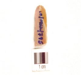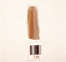 | Description / विवरण | A chert blade double ridge on dorsal, trapezoidal cross-section, prepared platform, bulb on ventral, distal end broken and use-wear marks on cutting edge. |