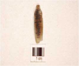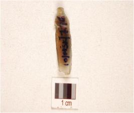 | Description / विवरण | A chalcedony blade prominent mid-ridge on dorsal, triangular cross-section, prepared platform, bulb on ventral and use-wear marks on cutting edge. |