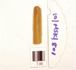 | Description / विवरण | A parallel sided chert blade, double ridge on dorsal, trapezoidal cross-section, prepared platform, and use-wear marks on cutting edge. |