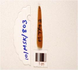| Description / विवरण | A chert blade prominent mid-ridge on dorsal, triangular cross-section, use-wear marks on cutting edge and pointed along distal end. |