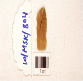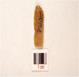 | Description / विवरण | A chert blade prominent mid-ridge on dorsal, prepared platform, bulb on ventral, triangular cross-section and use-wear marks on cutting edge. |